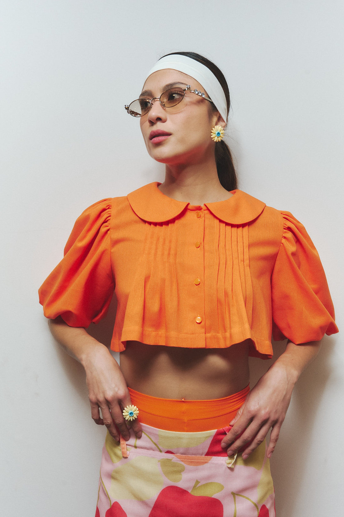 Cropped linen top in vibrant orange. Features a round neckline with an oversized collar, pintuck...
