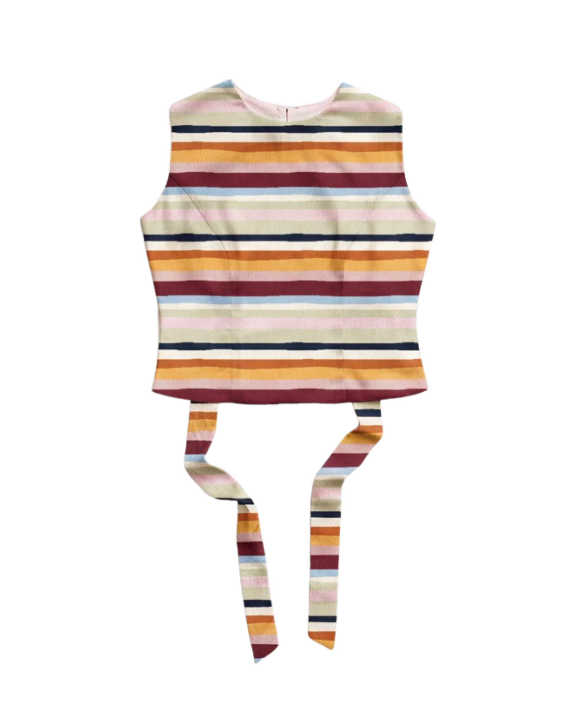 Top con escote cerrado y estructura recta. La espalda presenta una abertura amplia y un amarre central que permite ajustar la prenda con precisión. Colaboración con María Riba (2025)