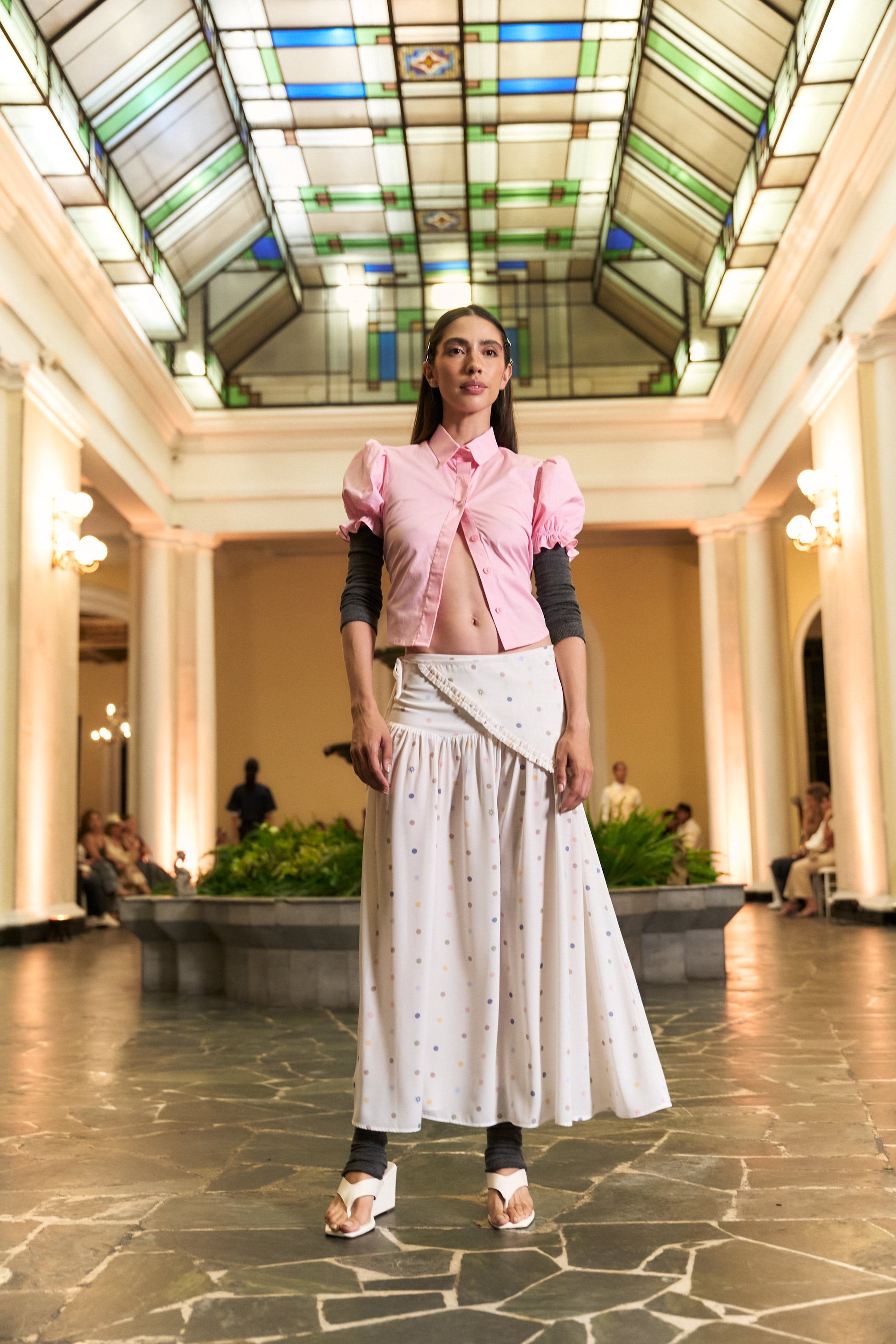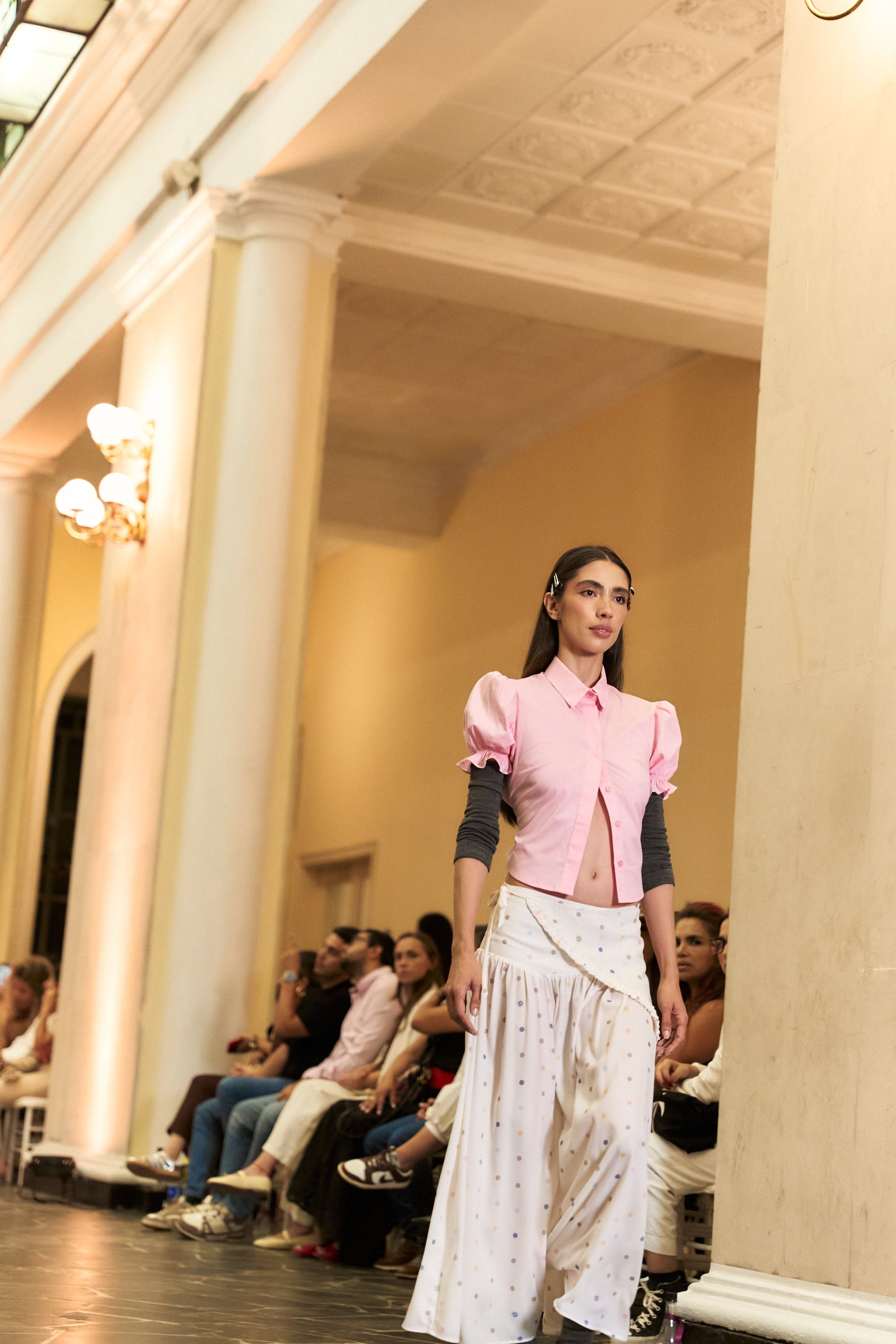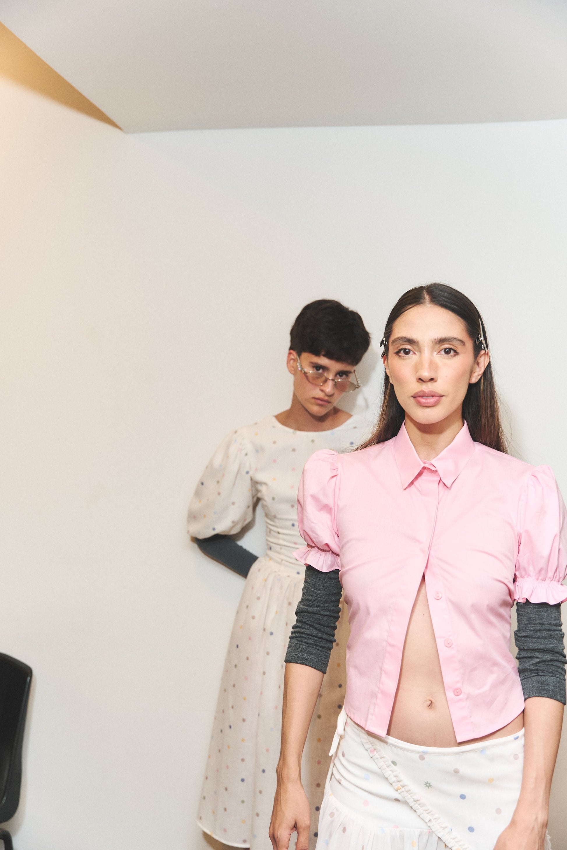Cotton shirt in pink, with a basic silhouette, shirt collar, and puff sleeves. Features a front button opening and back tie detail to adjust the waist. Designed and made in Colombia.
