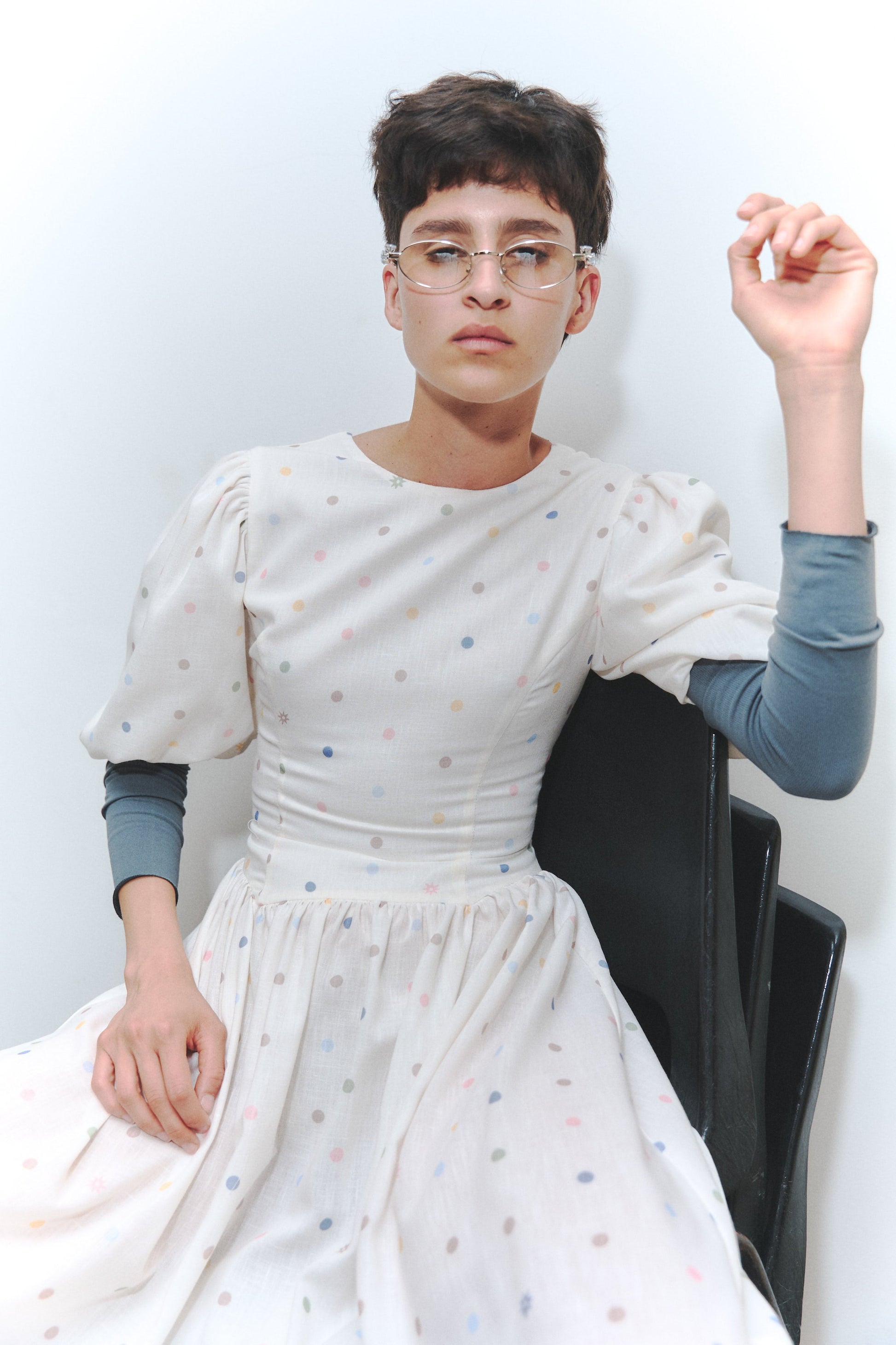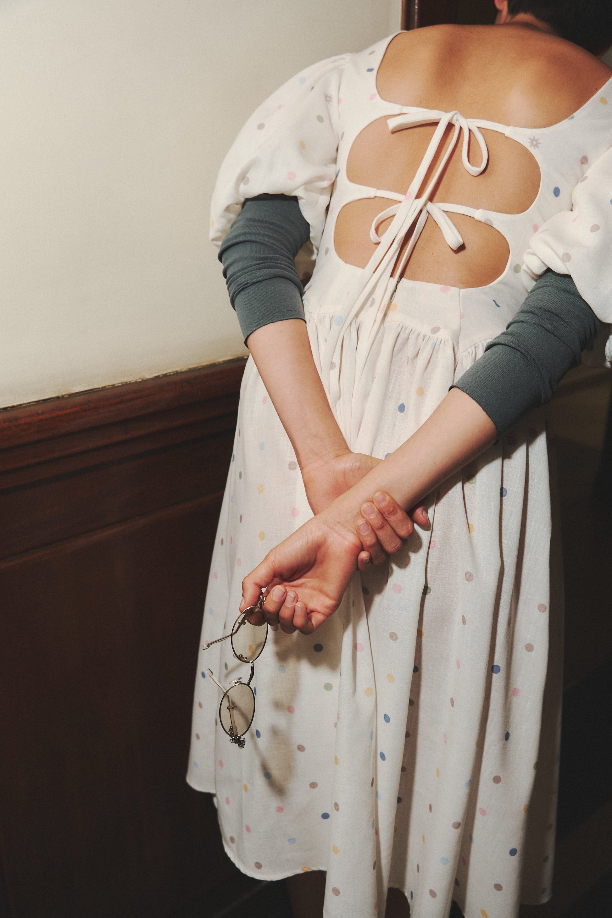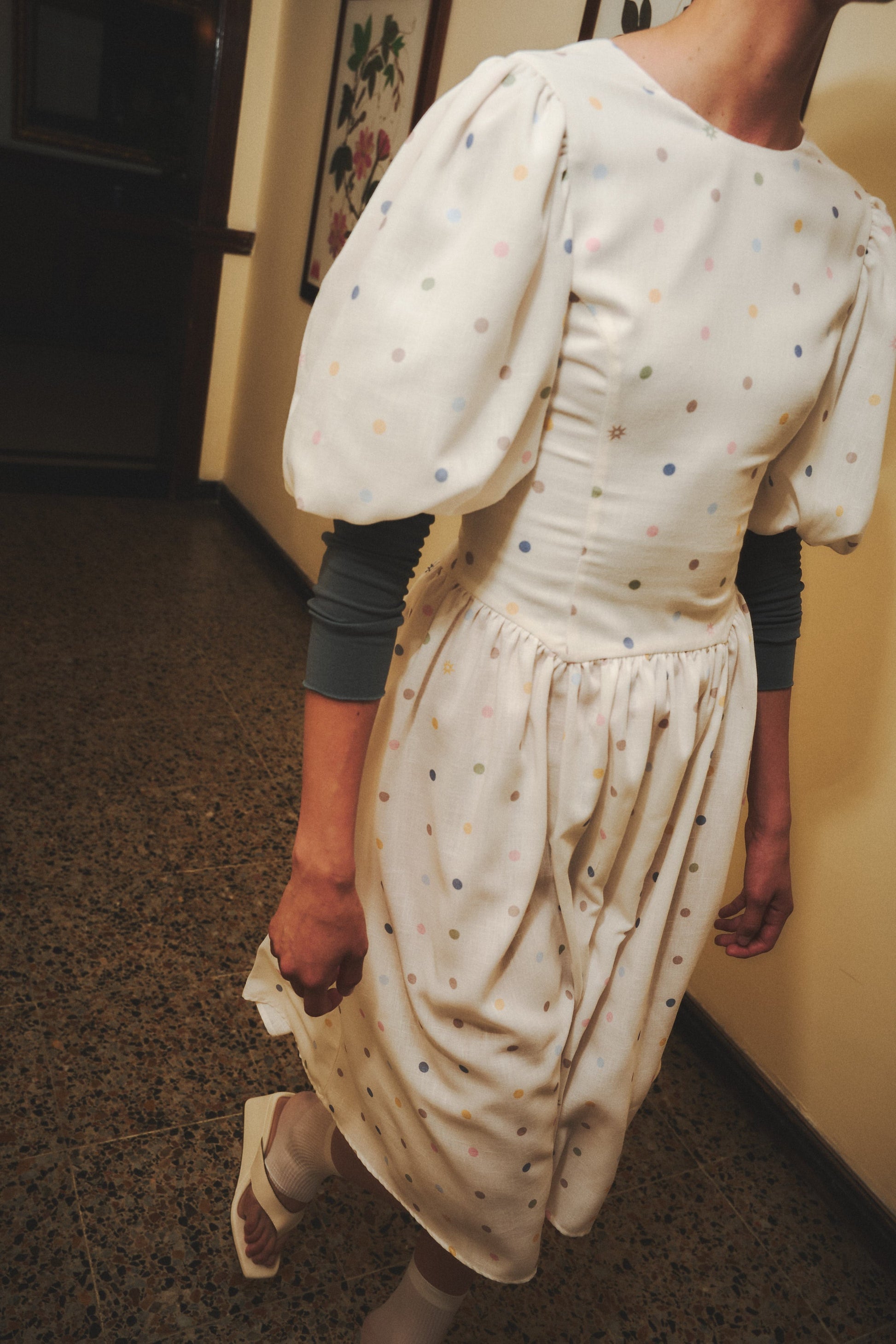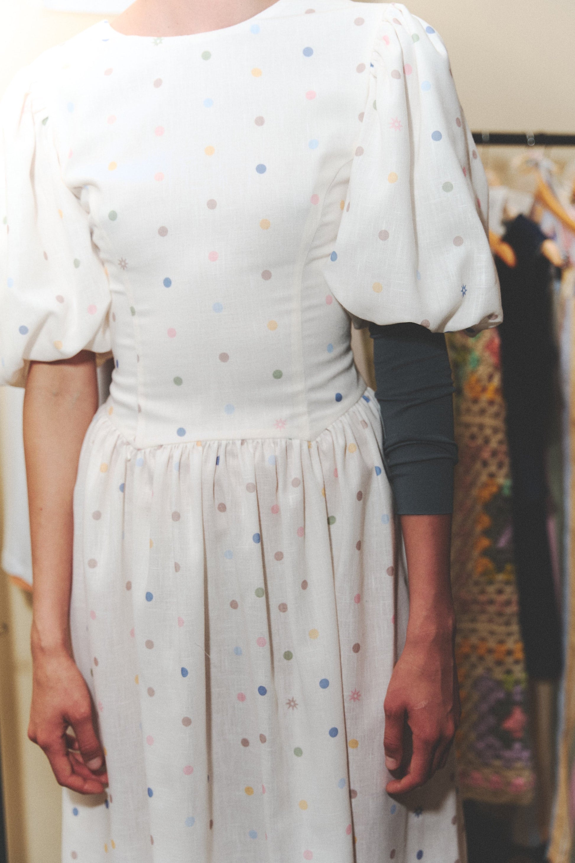 Midi linen dress in ivory with pastel polka dot print. Features puff sleeves and an open back with double tie. Designed and made in Colombia.
