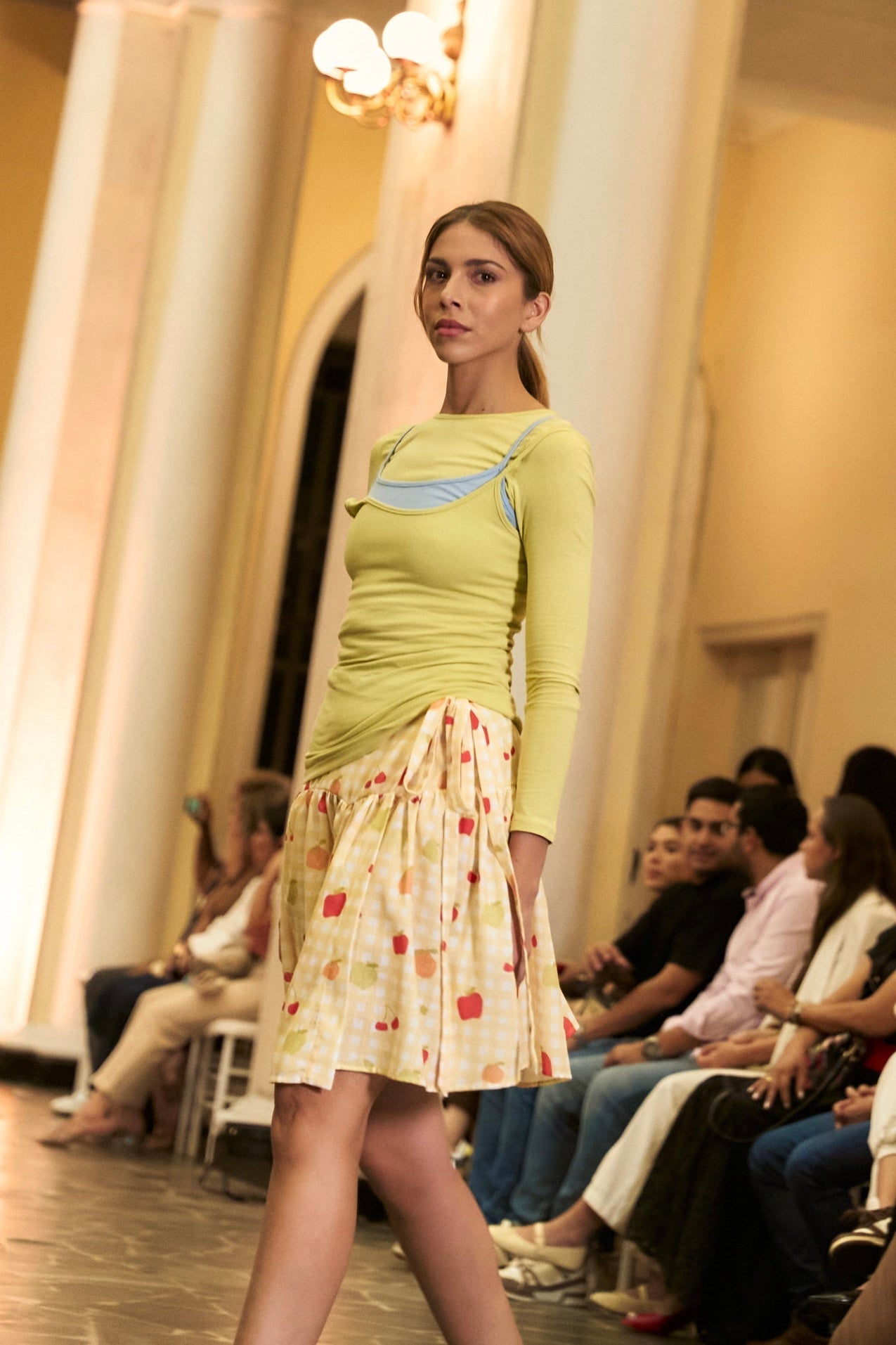 Short wrap-style linen skirt in ivory with Fruity print in pastel tones. Mid-rise with a wide, gathered silhouette, adjustable with a side tie. Designed and made in Colombia.