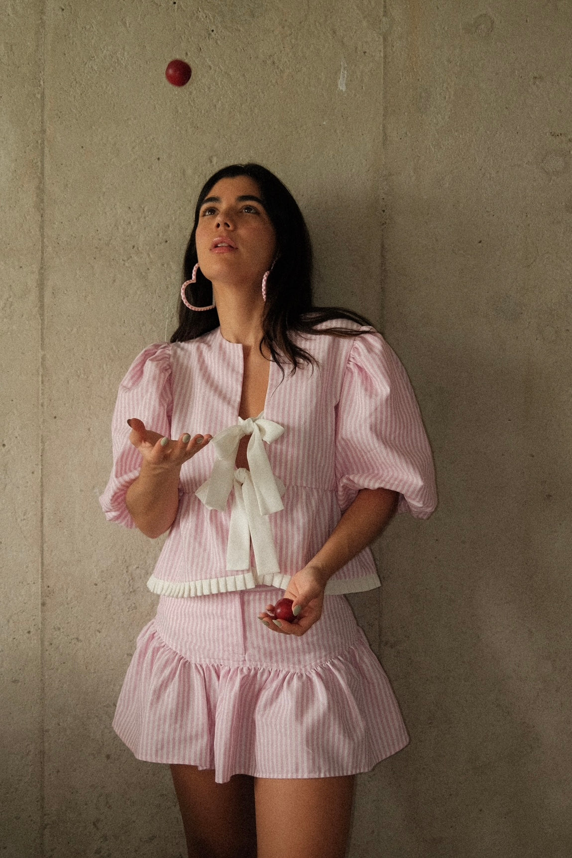 Printed top with puffed sleeves and cut at the waist. It adjusts at the front with two black ties. Designed and made in Colombia.