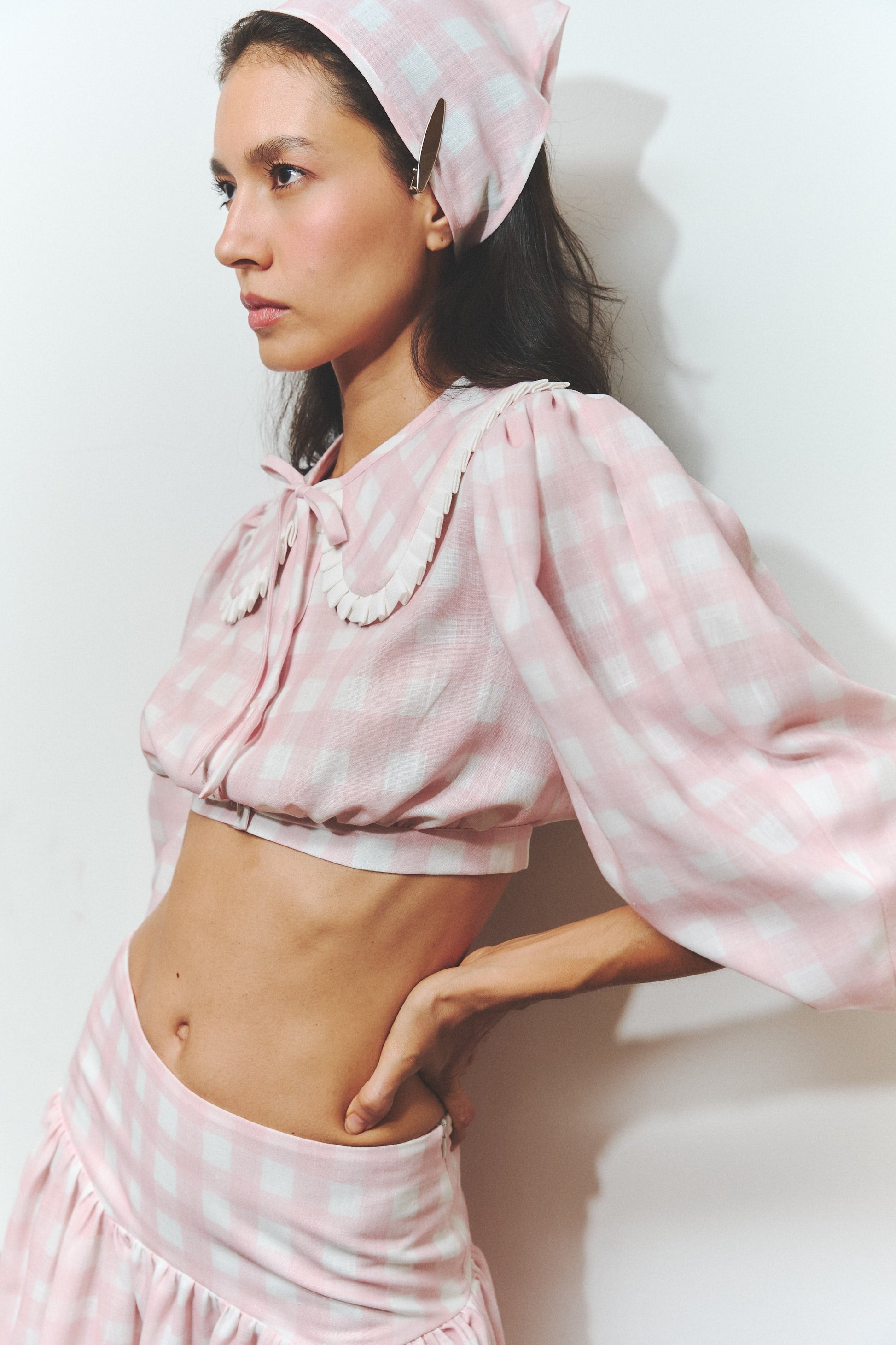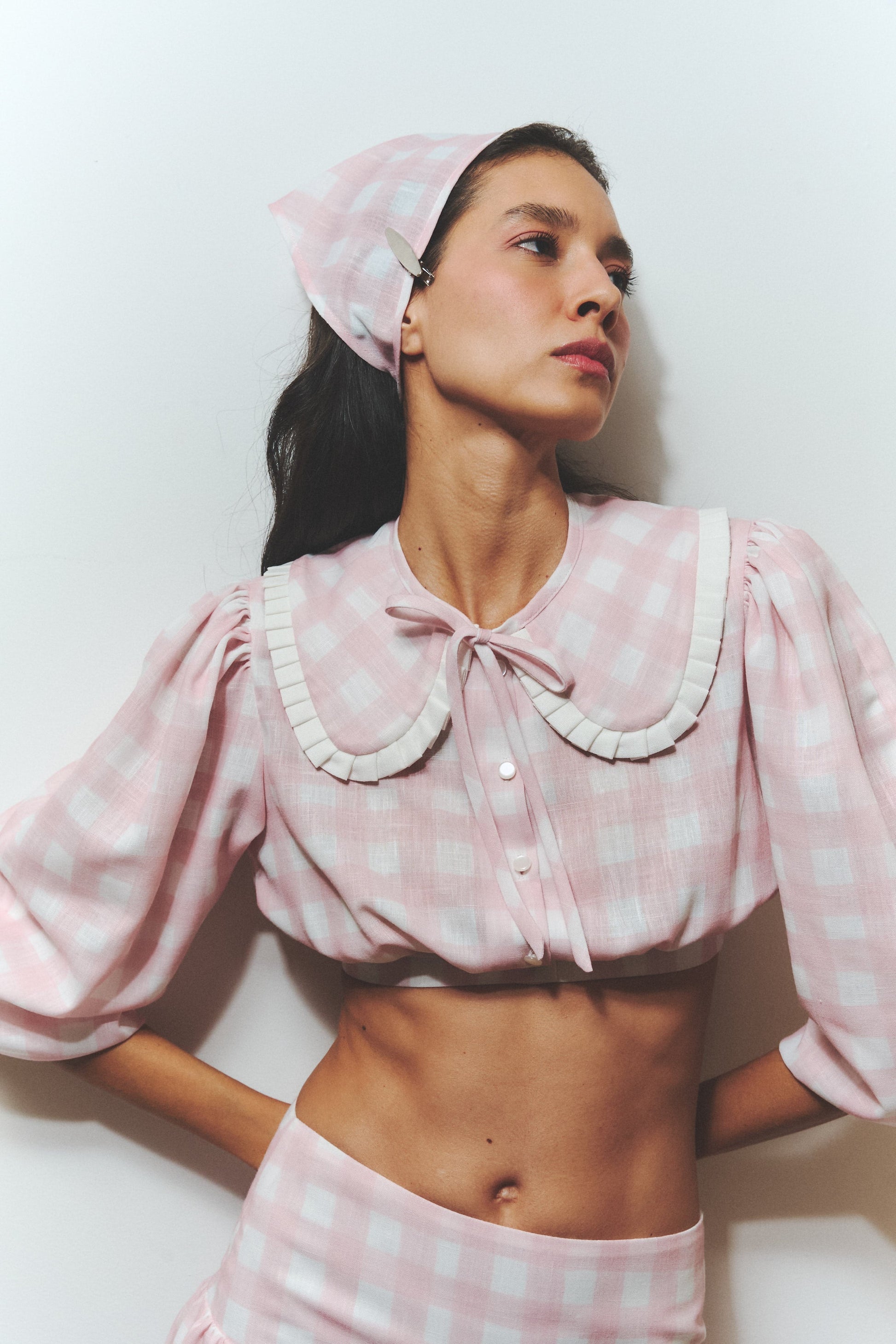 Cropped linen top in pastel pink gingham. Features an oversized collar with wavy detail and a front tie, puffed half sleeves, and a romantic silhouette. Designed and made in Colombia.
