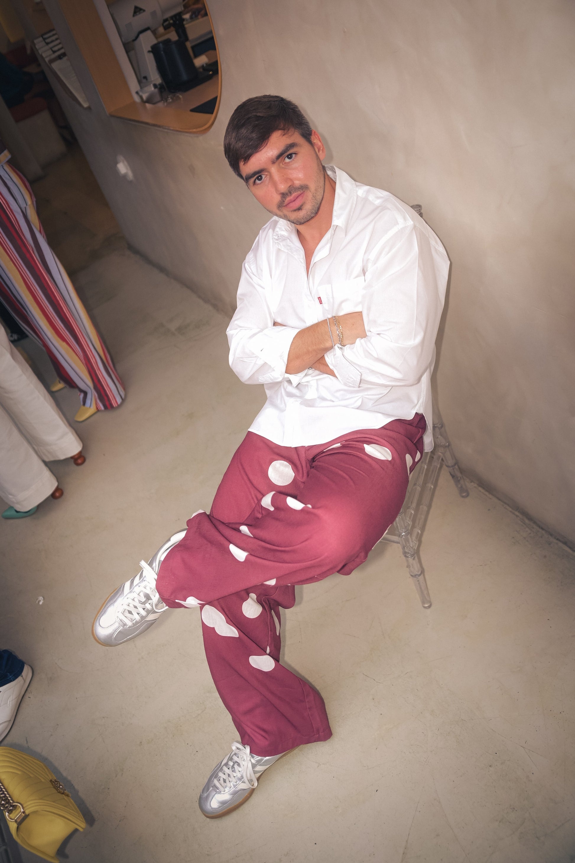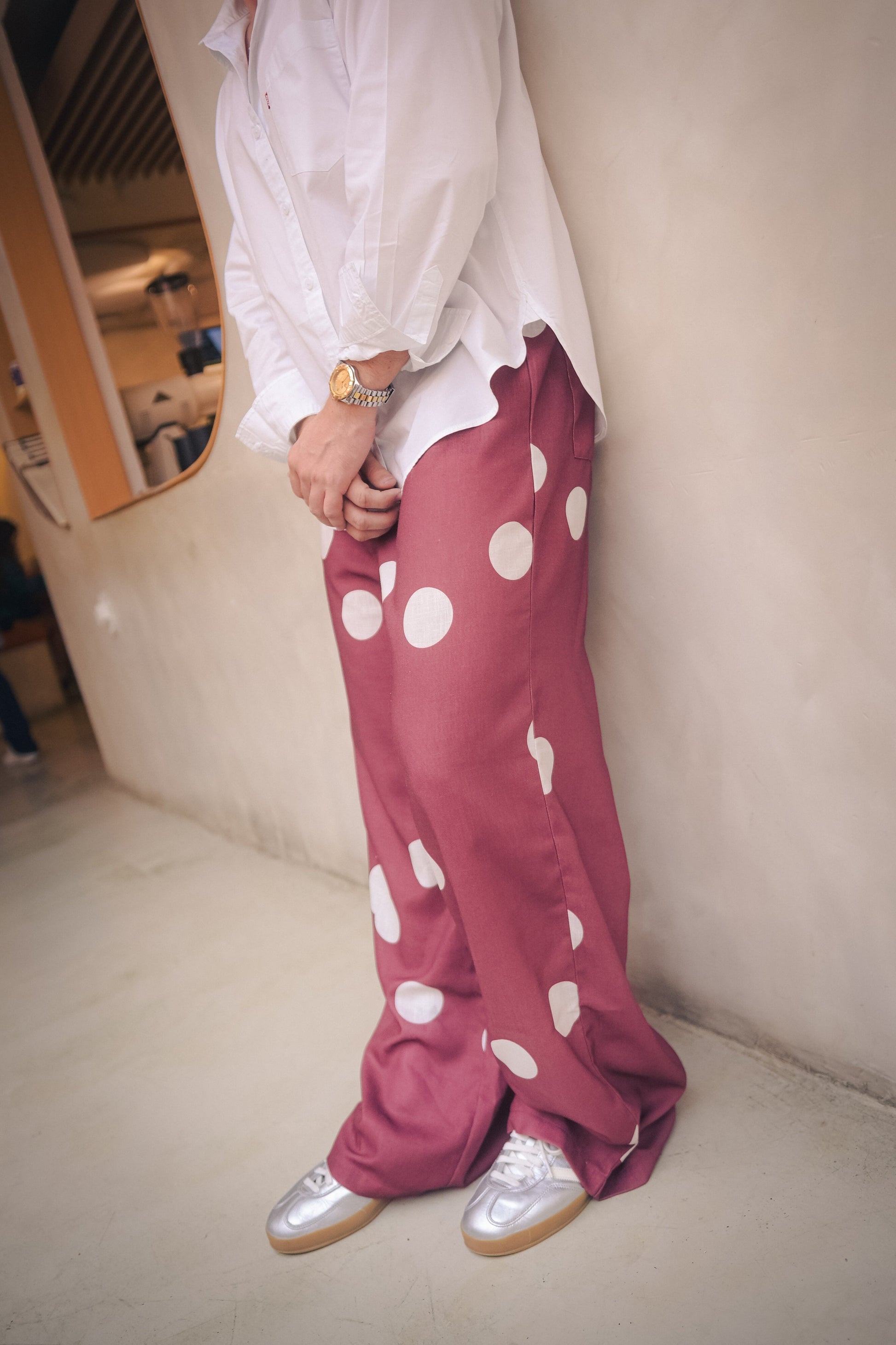 Pantalón estampado de tiro alto con prenses, botones ocultos y bota recta. Diseñado y confeccionado en Colombia. Colaboración con María Riba (2025).