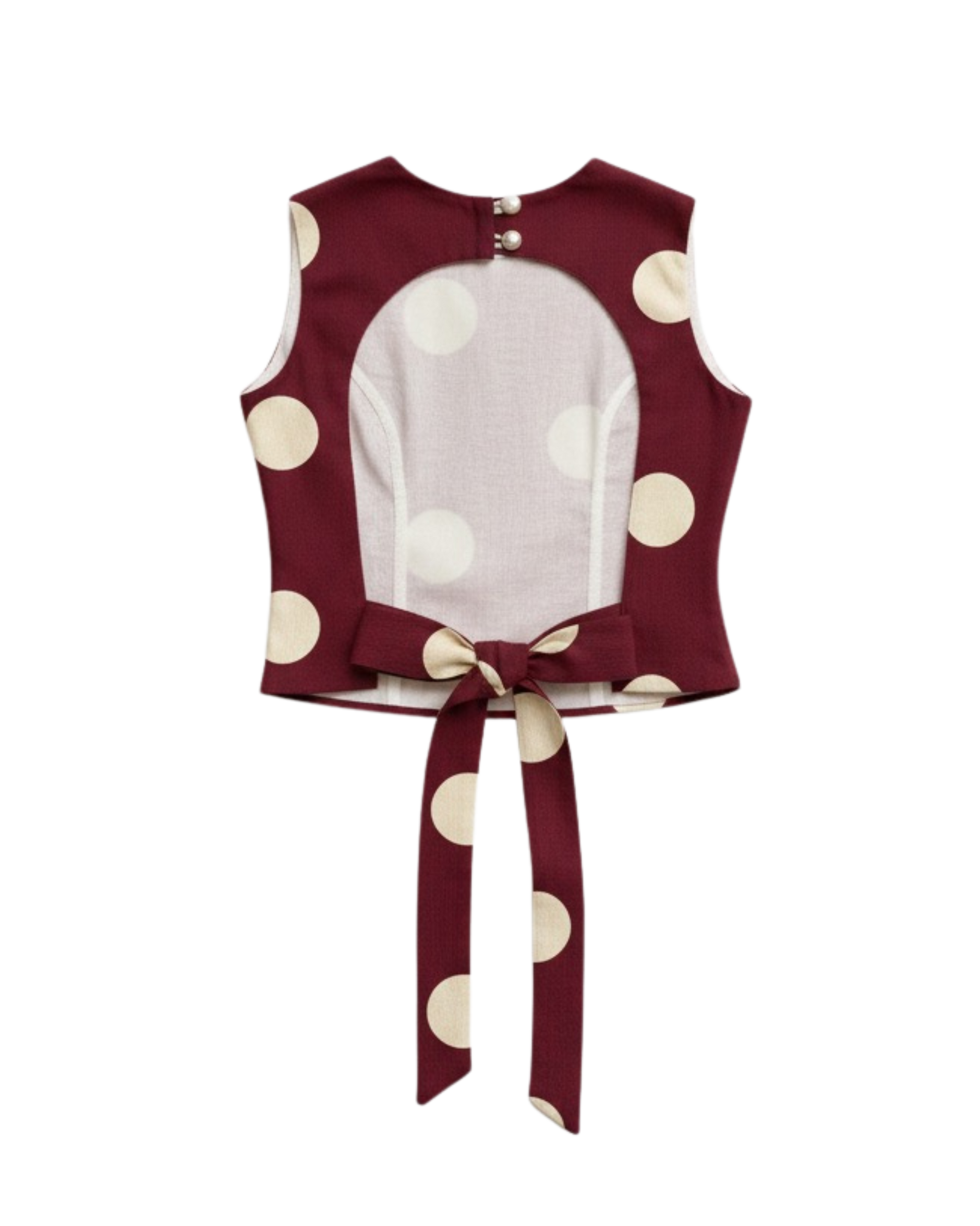 Top con escote cerrado y estructura recta. La espalda presenta una abertura amplia y un amarre central que permite ajustar la prenda con precisión. Colaboración con María Riba (2025)