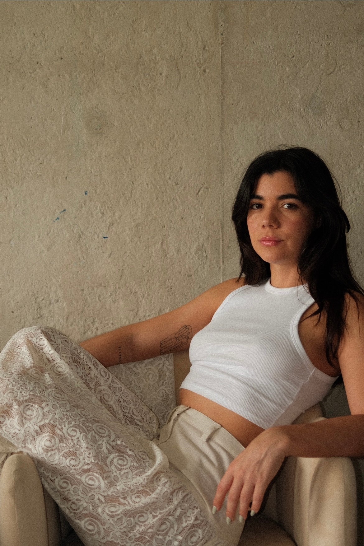 Short color block skirt (sand and ivory) with asymmetrical cuts. Timeless, comfortable and easy to elevate for any occasion. Designed and made in Colombia.